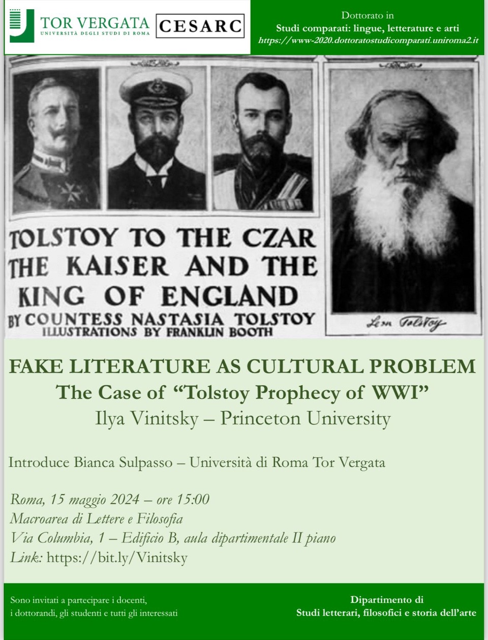 This talk is about an international (cross-cultural) faker from the Russian Empire who lived in the age of numerous fakes, worked in the biggest world production factory of fakes and spent most of his life in the country, which was obsessed, according to Umberto Eco, with the desire to fabricate the absolute (or perfect) fake. The lecture departs from the sensational case of Tolstoy’s prophecy of WWI and aims to introduce a new interdisciplinary methodology for an analysis of the phenomenon exemplified by the real author of the prophecy and, eventually, to lay the foundation for a new historical (sub)discipline dealing with the formation and cultural values of liars, forgers, and mystifiers. I propose to call this discipline cultural physallidology (from the Greek word “physallis ” [φῡσαλλίς],” an air bubble).